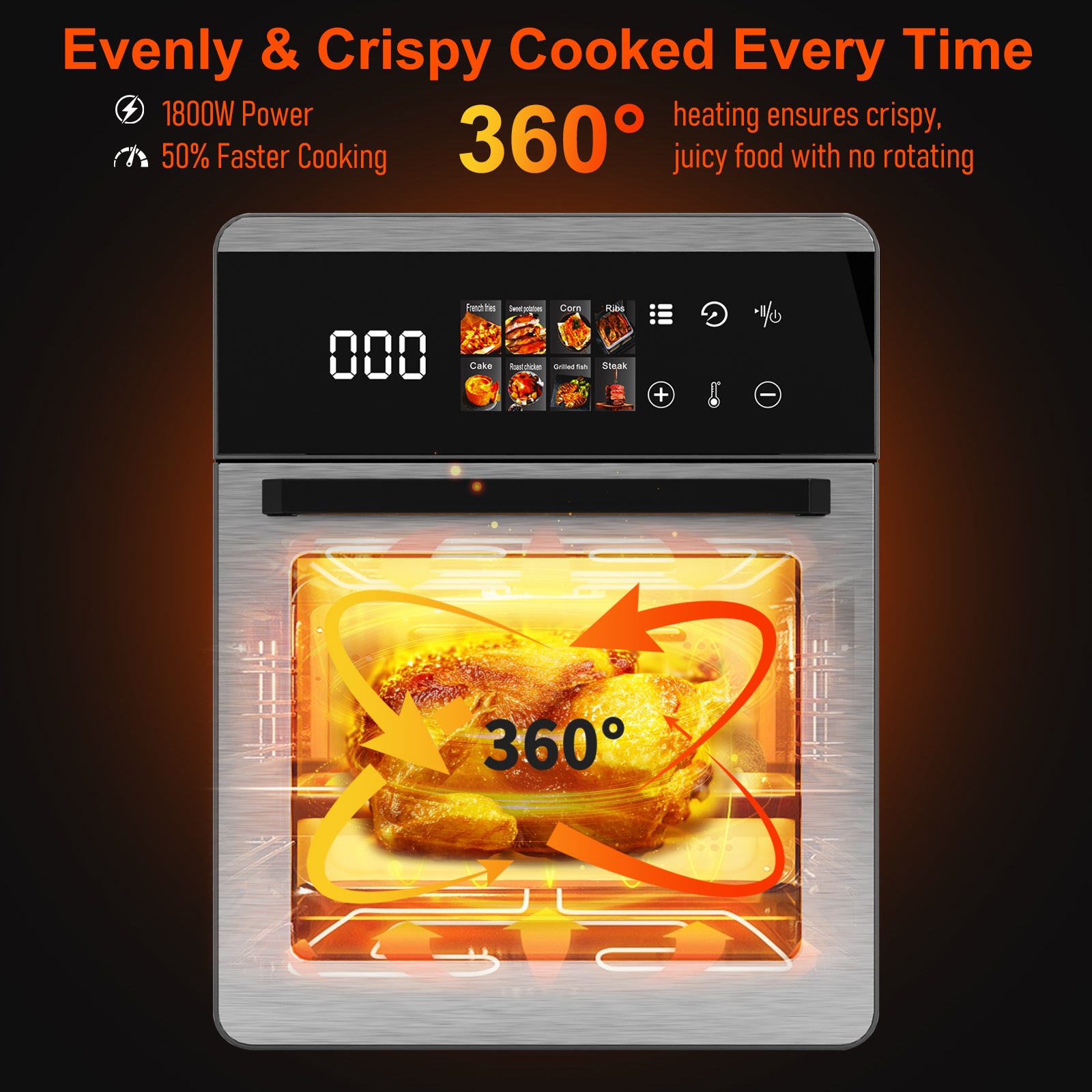 - 1800W Power with 360° Air Circulation: Our advanced heating system combines high-powered 1800W performance with 360° rapid air technology to ensure faster, more even cooking. Enjoy perfectly crispy exteriors and juicy interiors on all your favorite foods without the need for constant flipping or rotating.