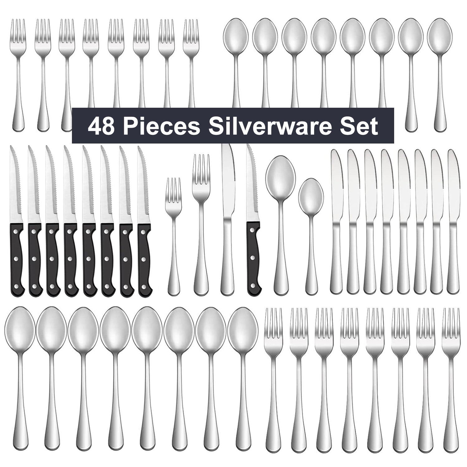 - Complete 24-Piece Flatware Set: This comprehensive set includes 4 dinner forks, 4 salad forks, 4 dinner spoons, 4 dessert spoons, 4 dinner knives, and 4 premium steak knives. Perfectly designed for full table service, whether you're hosting an intimate family dinner or a large gathering.