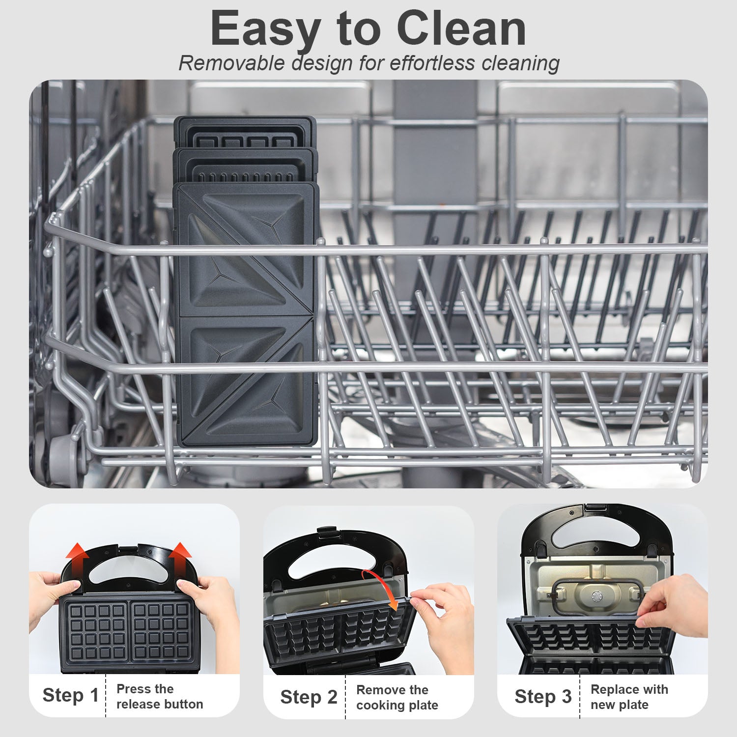 - 3 Removable Plates for Versatility: Includes a waffle plate for delicious waffle, a sandwich plate for toasty sandwich, and a grill plate for cooking steak, vegetables, potatoes, etc, and for pressing paninis. Easily swap plates to create a variety of meals.
