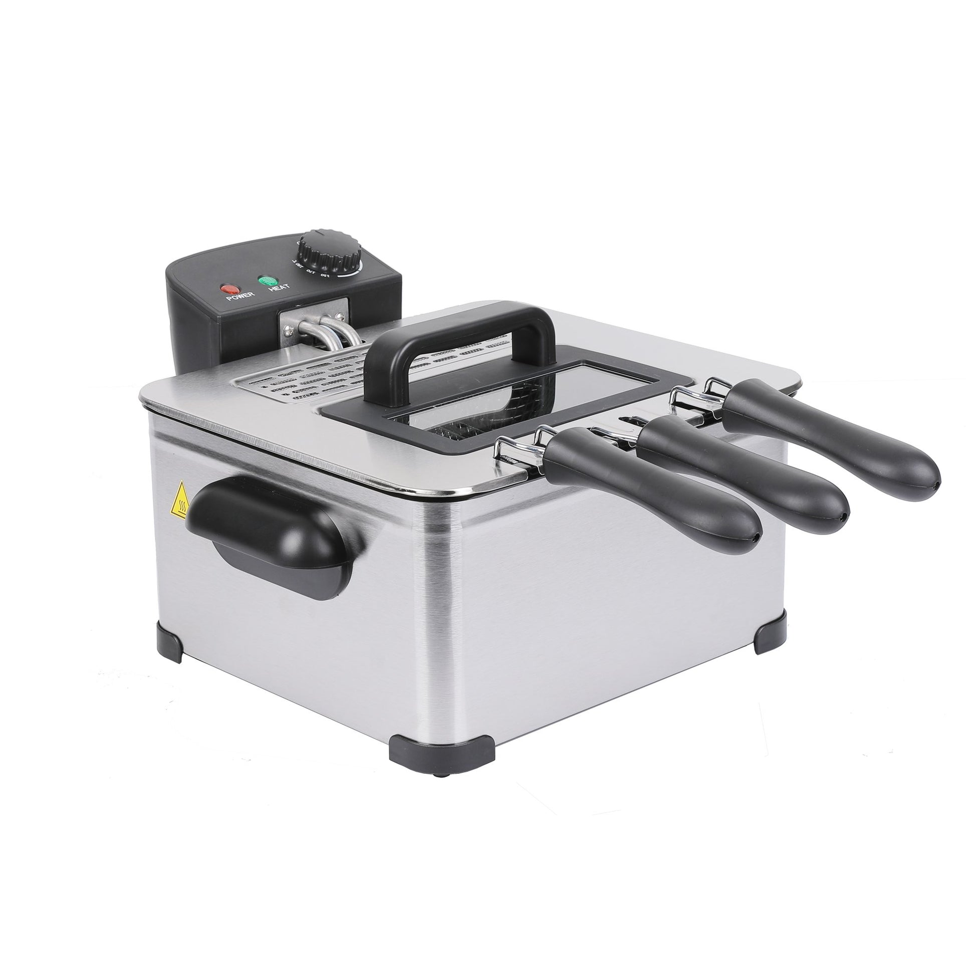 - Includes 3 Baskets: 3 frying baskets allow you to fry fish and chips simultaneously. The 5.5 liter enamel oil tank easily removes for cleaning.