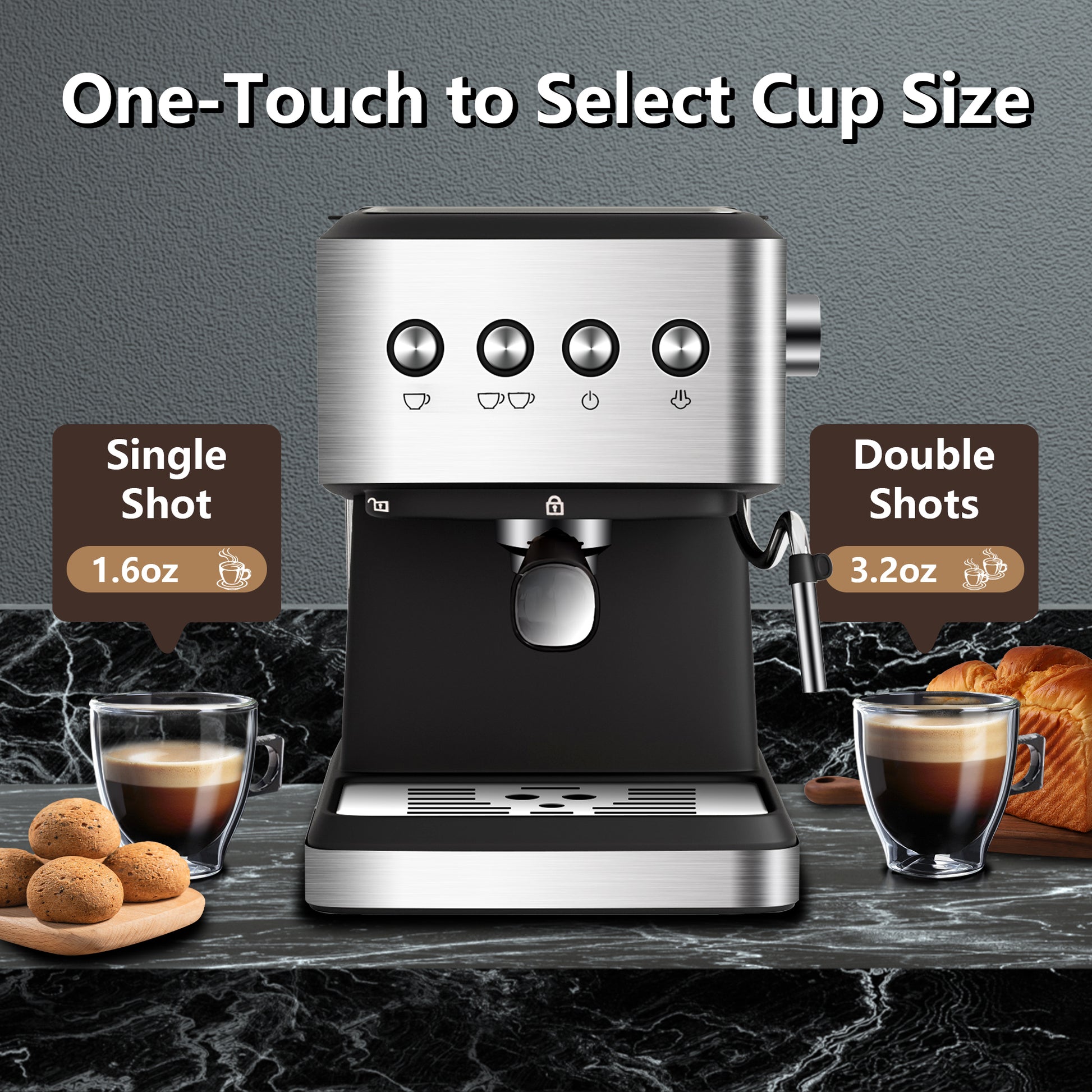 Bluebow Espresso Machine 20 Bar, 1.5L Water Tank Milk Frother Steam, Stainless Steel Coffee Maker, Silver