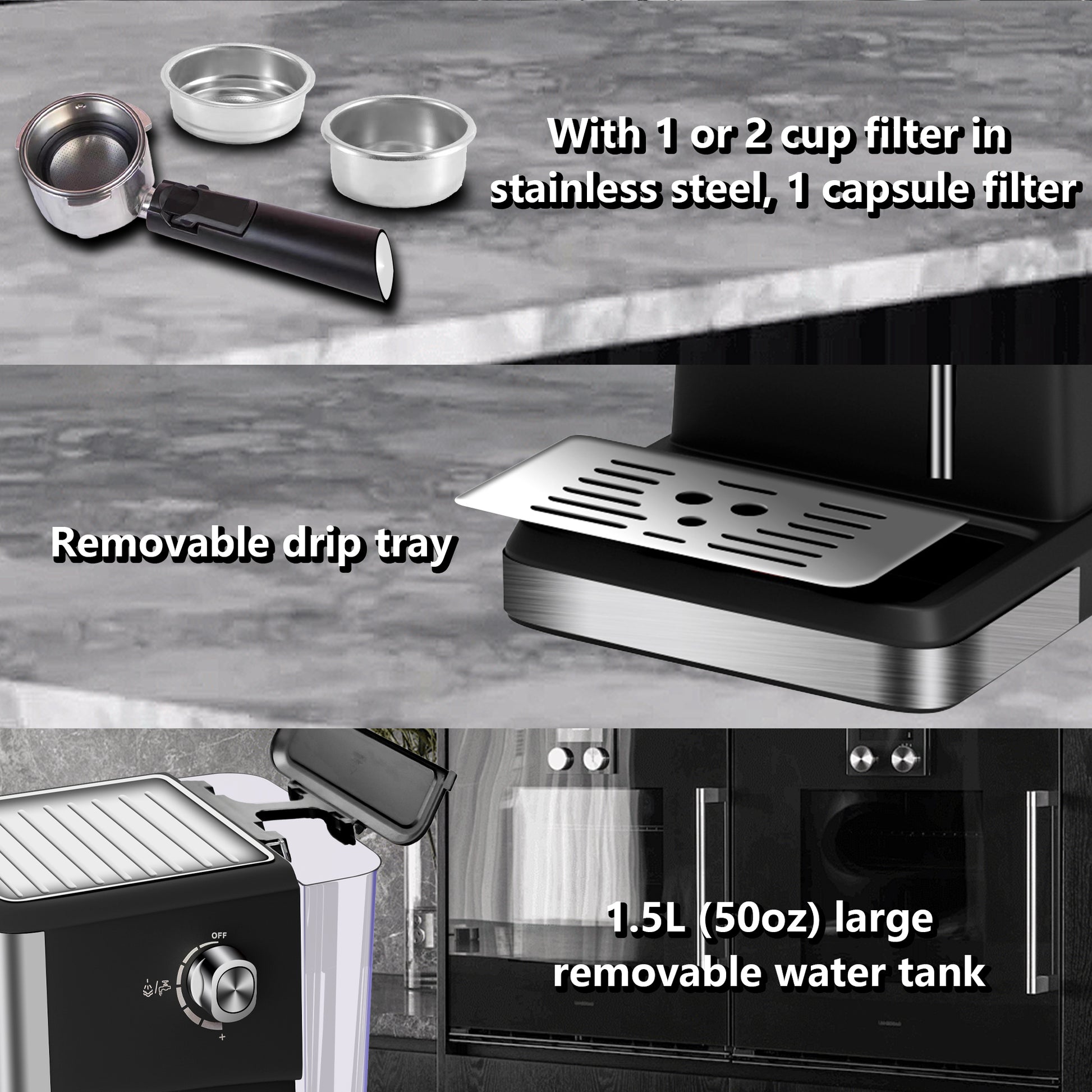- 20 BAR PRESSURE FOR HIGHER QUALITY EXTRACTION: The espresso coffee machine is with a 20 bar high pressure pump that creates nice dense, maximizes the extraction of the coffee beans aroma and develop the quality of the natural oils.