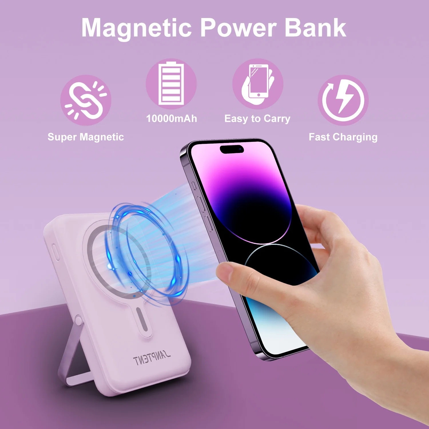 Magnetic Power Bank, 10000mAh Wireless Portable Charger with LED Display, Built-in Cables, Magsafe Charger with Foldable Stand, 22.5W PD Fast Charging for iPhone/Android, Purple