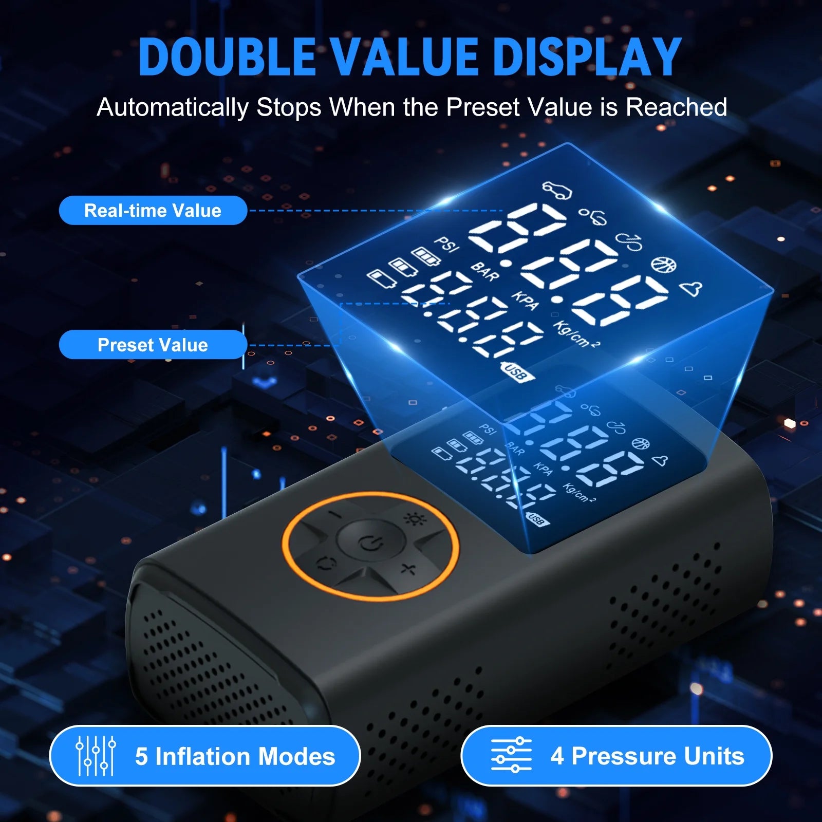 - This inflator offers 4 preset modes (car, bicycle, motorcycle, and custom) along with a high-precision sensor and a large LED screen that displays both the target pressure and real-time readings. It automatically shuts off upon reaching the preset pressure, preventing over inflation and ensuring fast, accurate, and safe inflation every time.Easily switch PSI, BAR, KPA and Kg/cm² with one click. In addition, the tire pressure memory function makes the operation smoother.