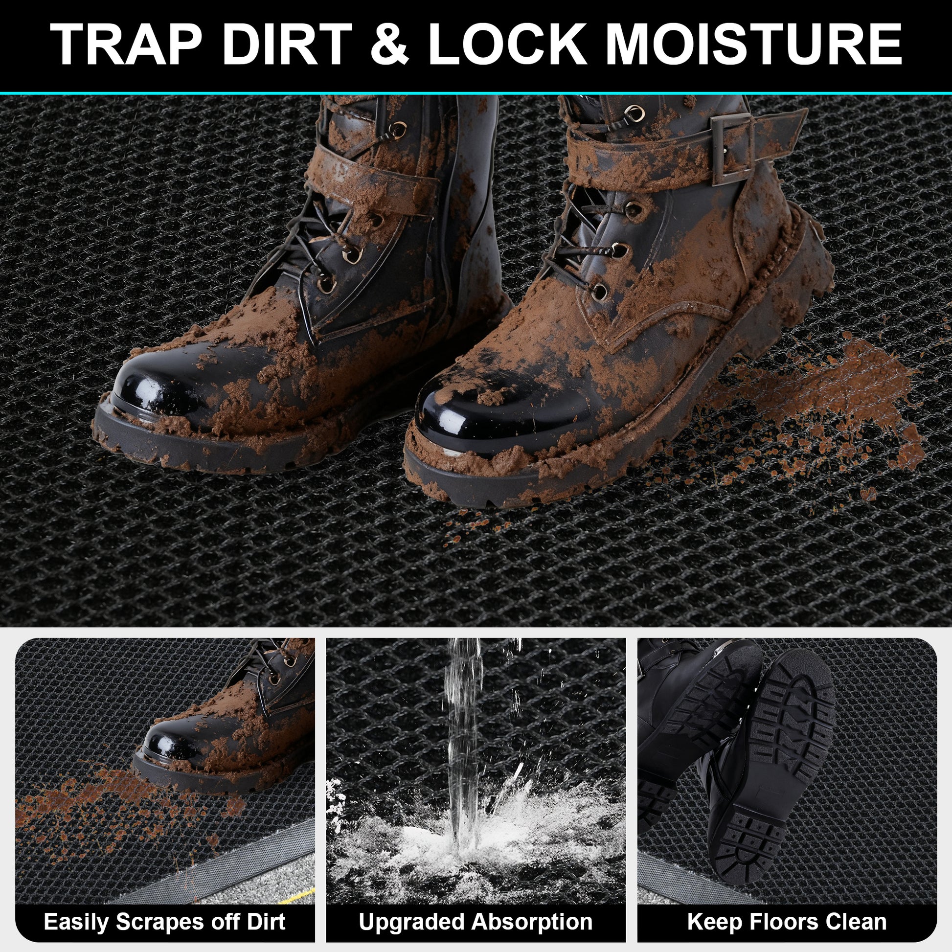 - 【Upgraded Absorption】This doormat features a mesh surface and a three-layer design with raised edges, which effectively scrapes off mud, sand, grass, and debris while also absorbing rain, snow, and moisture from shoes. The middle layer traps dirt and water, keeping surfaces cleaner for longer and reducing the need for frequent cleaning.