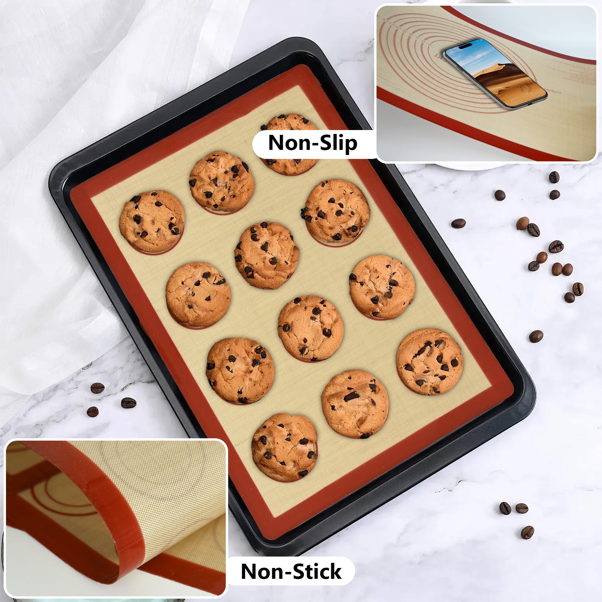 This premium silicone baking mat set is safe, non-stick, and reusable, giving you an easier and cleaner way to bake. Made with durable craftsmanship and designed to handle a wide temperature range, it ensures consistent results for cookies, macarons, pastries, and more. Easy to clean and simple to store, this eco-friendly set replaces disposable parchment paper, making it a smart choice for everyday baking or a thoughtful gift for any baking enthusiast. This set includes: a large pastry mat (26"x16"), a half-sheet macaron mat (16.5"x11.6"), a quarter-sheet macaron mat (16.5"x11.6"), a 9" pizza mat.