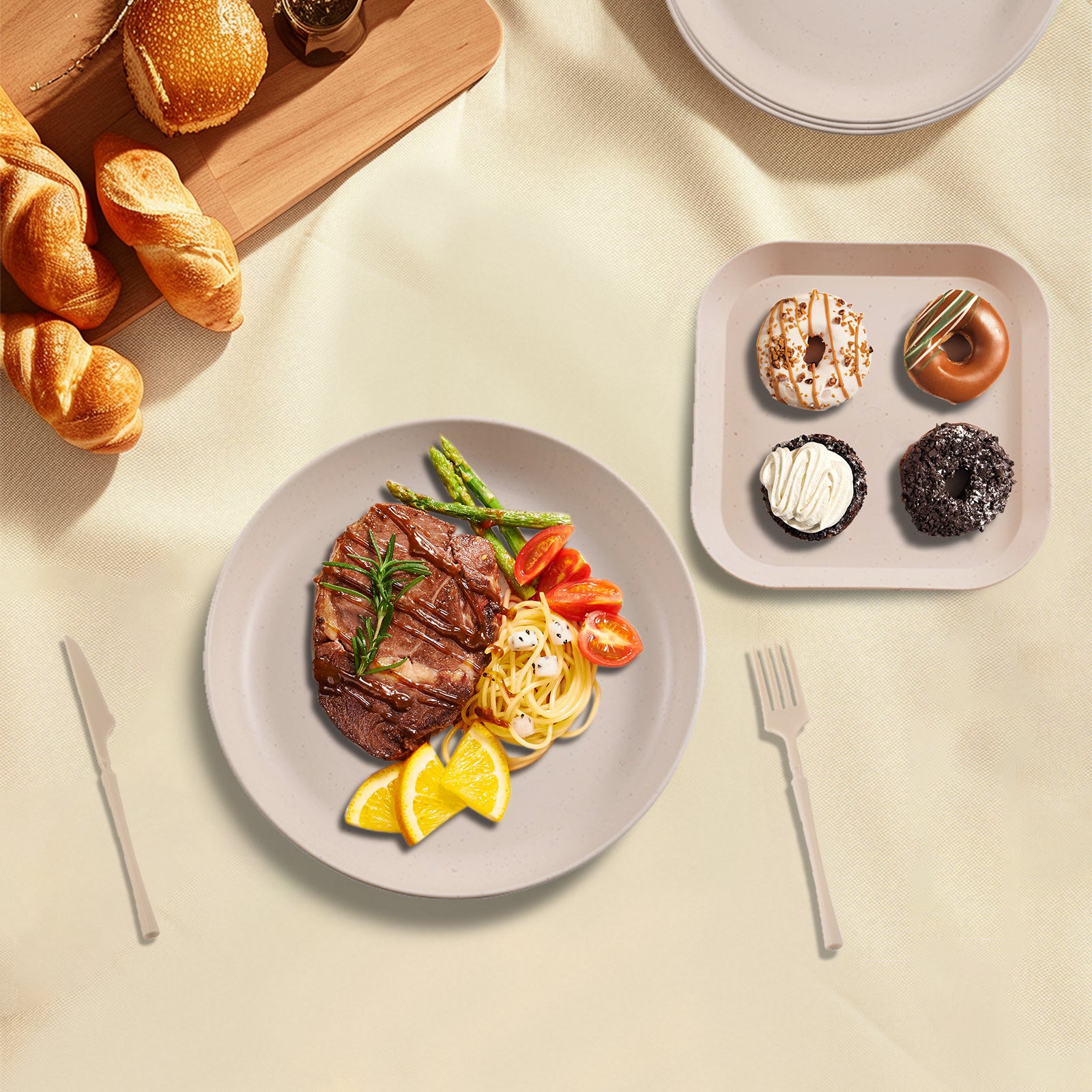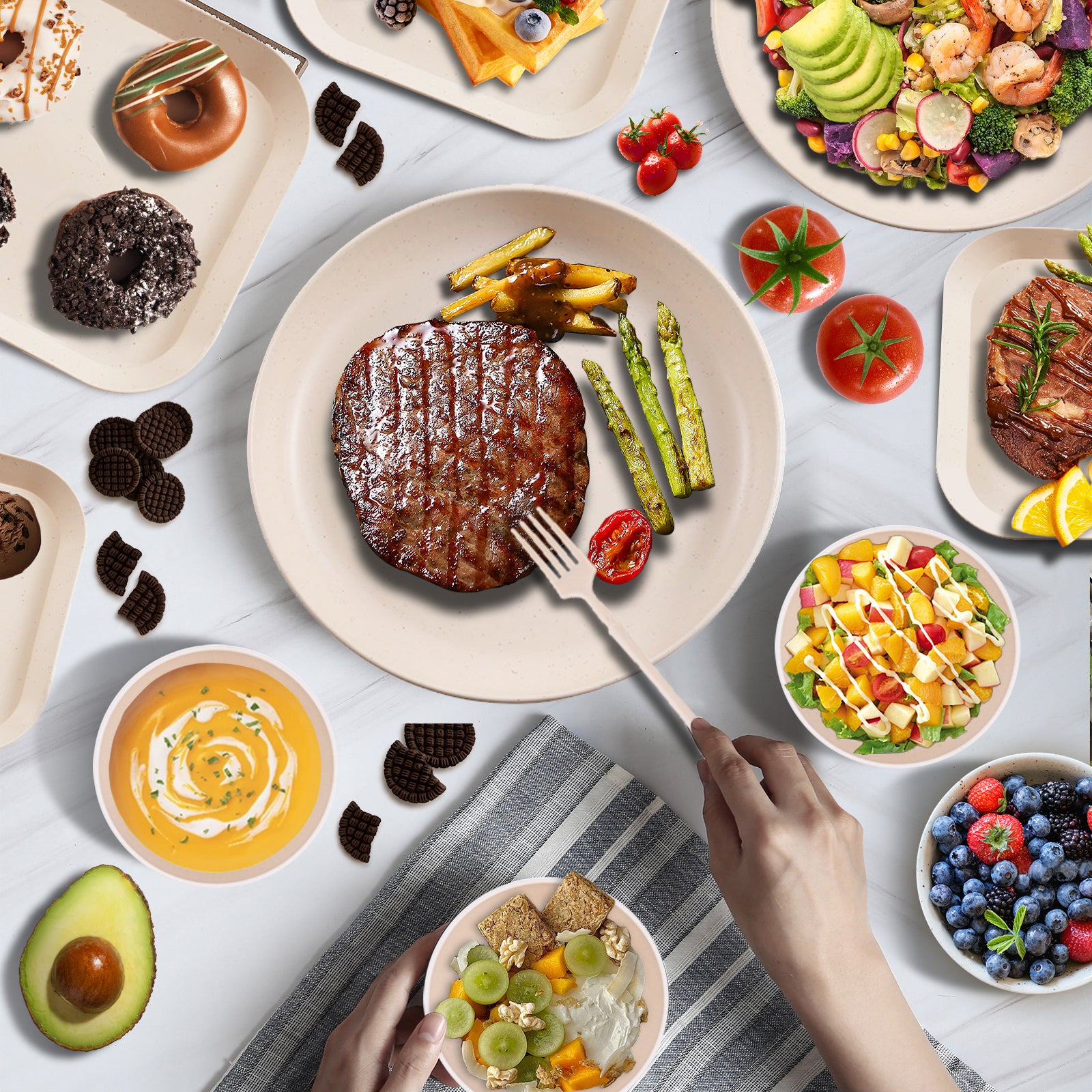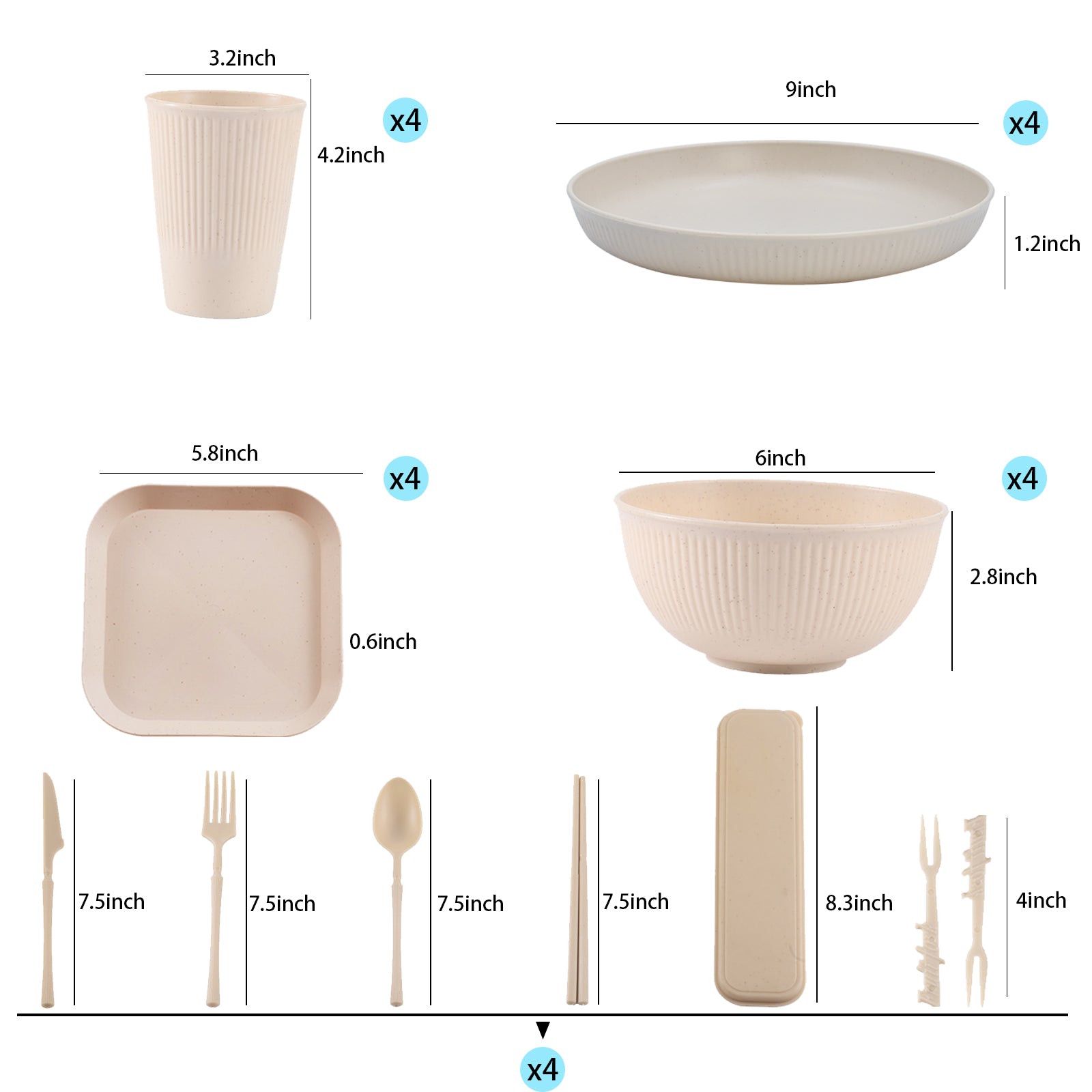 Soulgenix wheat straw dinnerware set includes 4 dinner plates, 4 dessert plates, 4 bowls, 4 cups, 4 cutlery sets, and 8 fruit forks, providing everything you need for family meals or gatherings.