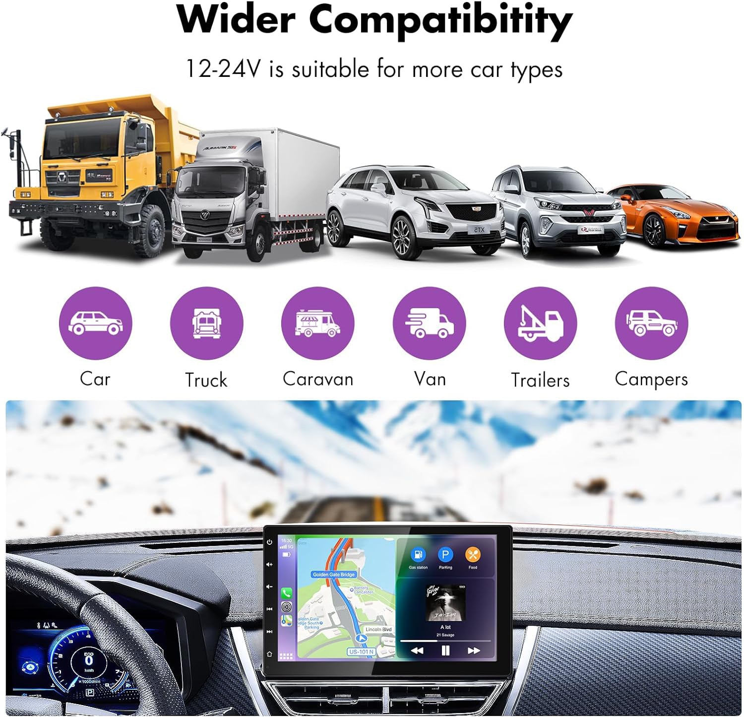 - Easy Installation & Extensive Compatibility: Experience hassle-free installation with our portable carplay screen, designed to be compatible with 99% of cars. Enjoy the convenience of an adjustable mount, allowing secure placement on your dashboard without the need to disassemble your existing car stereo system. Simply plug it into the cigarette lighter, and this versatile touch screen radio becomes suitable for a wide range of vehicles, including cars, semi-trucks, pickups, vans, and more.
